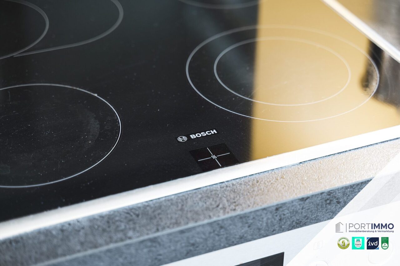 + Moderne Einbauküche: Geschirrspüler, Herd mit Ceranfeld, Backofen, Kühlschrank und Gefrierschrank, Dunstabzugshaube, Mikrowelle, innenbeleuchtete Schränke.