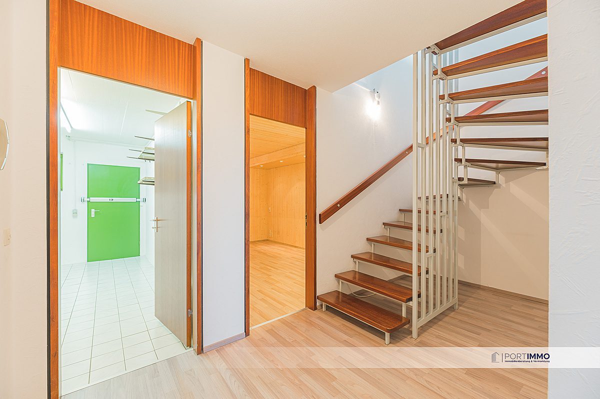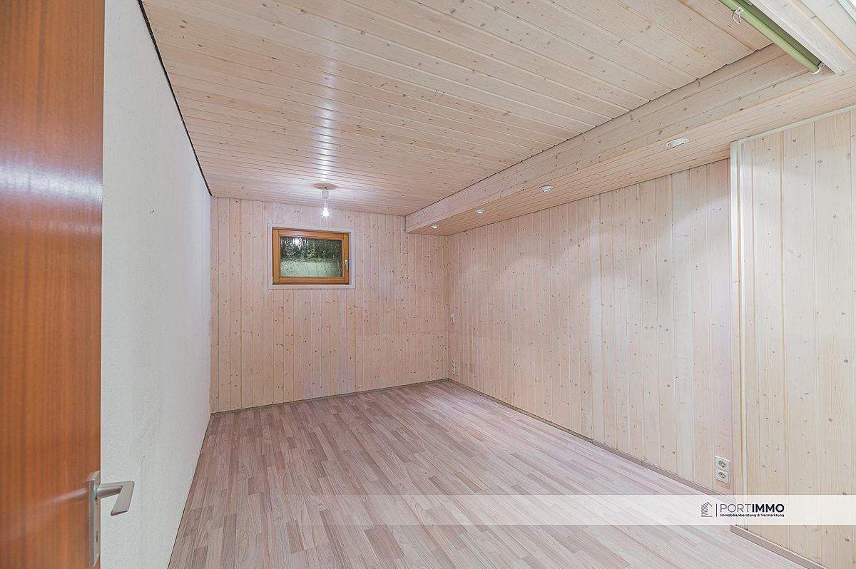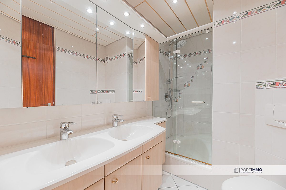 Von dem Wohnbereich gelangen Sie über die Wendeltreppe in das Untergeschoss. Zu Ihrer Rechten finden Sie zwei Hobby-Räume, welche Ihnen zusätzliche Fläche bieten. Weiter finden Sie ein schönes Badezimmer mit zwei Waschbecken, einer Dusche und einer Badewanne. Das Badezimmer ist mit modernen hellen Badfließen ausgestattet.